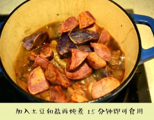 焖煮三十分钟后加入土豆,如果锅内汤汁烧干了加点水,在加土豆的同时加少许生抽和白糖调味。再次盖上盖子焖煮至土豆变粉。