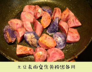 同时土豆切块用水浸泡,浸泡是为了冲洗掉土豆上的部分淀粉,也能防止土豆变色