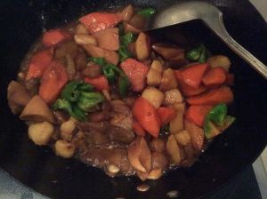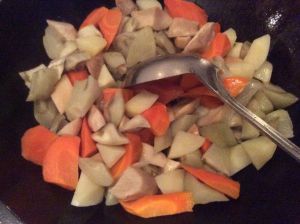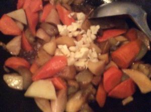 倒入煎熟的茄子块和土豆块翻拌均匀