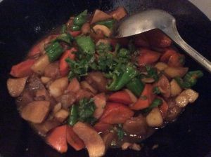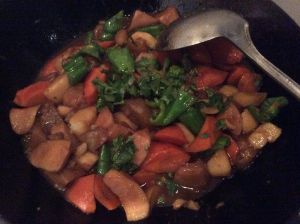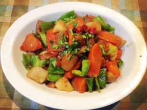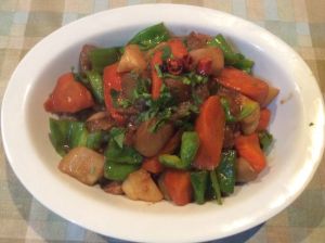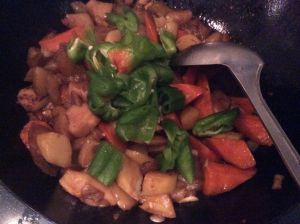 锅中留少许低油,中火,放入青椒块翻炒几下
