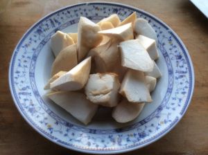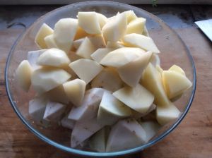 锅中放入少许油,烧热后加入沥干水分的土豆块。我这次因为家里没有熟油了,所以放的油多些,平时只需放至土豆块的一半高度就行了。比平时炒菜的油多些即可。