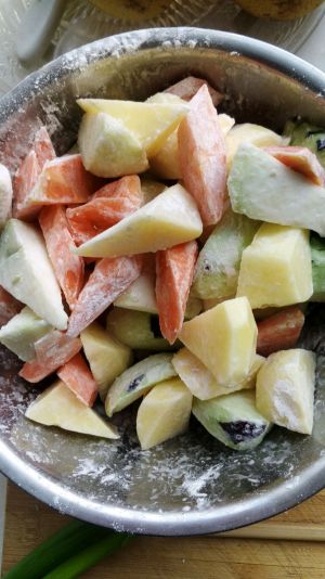 土豆、茄子去皮洗净切块。取一平底锅,锅热后放入茄子块,中火,煎茄子。不用担心会沾锅,因为锅已事先烧热,茄子在煎熟的过程中会出水。