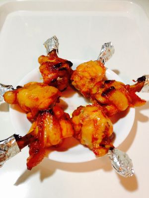 1.翻面、刷料汁、稍整形、再烤十分钟。2.然后再翻面烤五分钟(翅根肉比翅中厚,有耐心),筷子扎透了熟了。