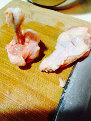翅根洗净,表面划几刀(入味儿),根部的筋切断(小心点),用刀往下推。