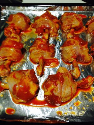 至少腌制两个小时后,锡纸刷油、放鸡翅。烤箱预热、200度、上火、中层、先烤十分钟。
