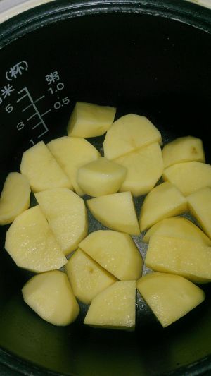 然后把土豆去皮,切大块!放入电饭煲中,一层就好,不能太多!我用了两个!刚好放满一层煲底!