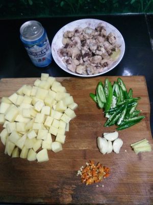 土豆切小块 材料准备好 先放姜蒜 辣椒干 然后鸡块倒进去翻炒 再倒老抽生抽 待鸡块入味 土豆倒进 一罐啤酒 放点八角 中小火去闷