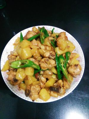 油下锅,放入切好的葱姜,煸炒,放入鸡块煸炒至金黄色,放入切好的土豆,继续煸炒。