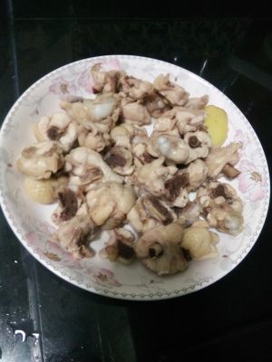鸡腿肉切成小块,凉水下锅,煮沸,去除血水