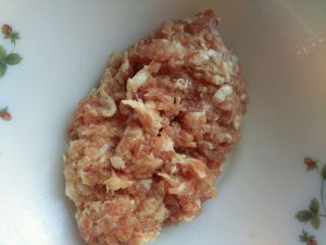 去掉虾肉包装,新鲜的鳞虾肉个子都很小,像米粒那么大,很鲜美。选择瘦肉,剁成肉泥,和虾肉放一起。