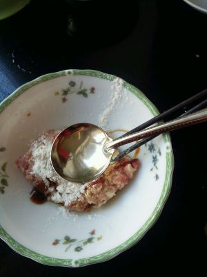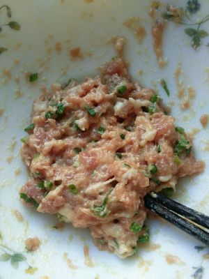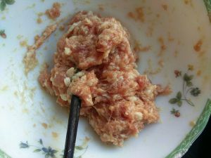 顺时针搅拌均匀,可以加个鸡蛋让肉馅增鲜,让肉馅更嫰,我鸡蛋用完了,就用上图的勺子加一勺水代替鸡蛋顺时针搅拌,搅到肉馅上劲再加一勺水再搅到上劲就可以了