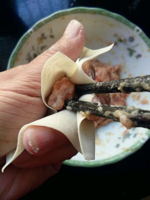 拌馅的时候加入少许水,顺着一个方向搅拌,馅会更嫩更弹牙。拌好的馄饨馅待用。