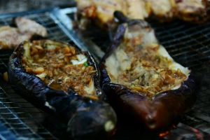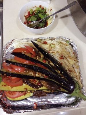 酱做好了就烤茄子咯 如果是烧烤炉那就直接把茄子扔进去烤 如果是烤箱 也是直接扔进去烤 一直看到他瘪瘪的看起来缩水的样子就可以从头到尾划一刀这时里面還會有点水分茄子肉和皮这时已经可以分离了 就将蒜蓉酱放进去 喜欢的放多点没关系继续烤~\(≧▽≦)/~