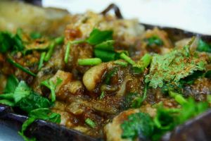 蒜蓉用少量的油炒香,加一点酱油,一点点陈醋,一点水调匀,淋到茄子肉上
