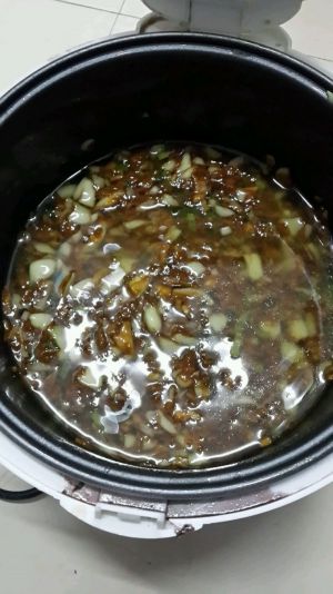 热锅凉油,加入葱花蒜末爆香后,加入酱料翻炒片刻。之后加入少量稀淀粉水,翻炒略粘稠,出锅备用。