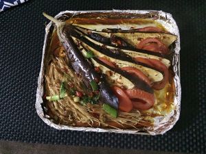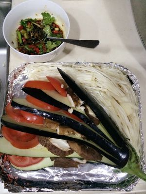 为什么说超简单因为真的好简单--把茄子连着头切片-相间接的放入番茄、香菇--本人喜欢烤金针菇所以也把它放到了旁边--其实本人觉得这菜也属于烤时蔬每个人都可以放自己喜欢的材料哦--并非本创是在其他网站看到偷学琢磨的就觉得简单方便好吃拉!