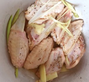 鸡翅洗净,放入 葱、姜、料酒、黑胡椒适量,挤一些柠檬汁。腌制约15分钟。