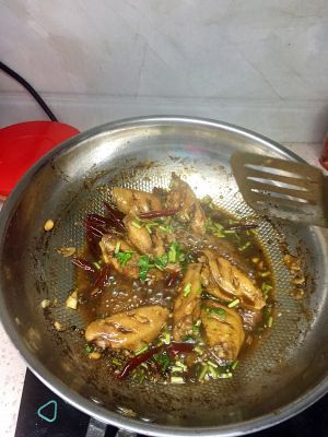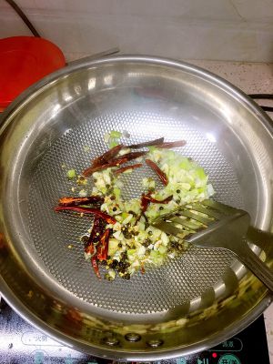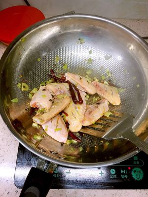 少量油(因为鸡翅也会出油),小火。葱姜蒜,辣椒,麻椒,一起下锅,爆香