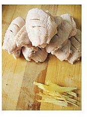 鸡翅中洗净,在表面开两刀;姜洗净,切一大片,改刀成丝