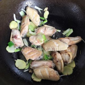 1.鸡翅斜切两刀,锅中放水,煮开后,放入鸡翅,煮两分钟,捞出后晾干水分。另起锅,放油,煎一下鸡翅,倒入葱姜(由于个人爱吃姜,所以放的有点多)