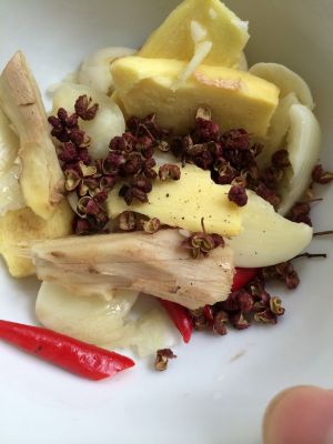 锅里油烧热,放入姜炒香再入辣椒花椒。