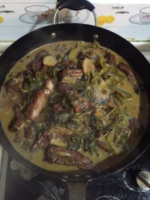 然后锅里放油和辣椒把排骨翻炒,然后放水和酸菜