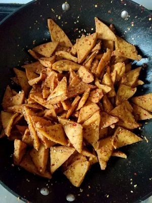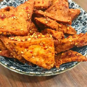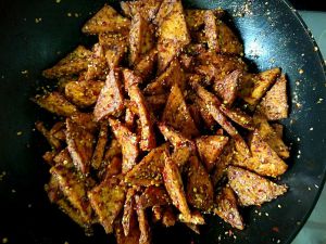 再把麻辣味加重倒进豆腐干,同样开小火拌匀收汁,重辣可以出炉了