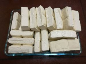 豆腐切块,放煮沸的盐开水焯五分钟,捞出沥水。