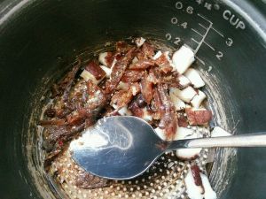 3.油热后放入香菇丁和豆豉鱼,香菇条先不要放,最后焖饭时候再加进去,记得要放豆豉啊~