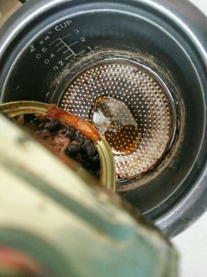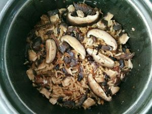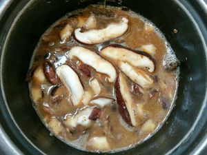 6.加入热水,莫过食材大概两节手指肚,4cm左右吧大概(其实依自己口味来了,喜欢硬的就少放点水,喜欢软的,多放点咯),加入香菇条~剩下的交给电饭锅吧