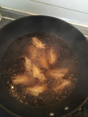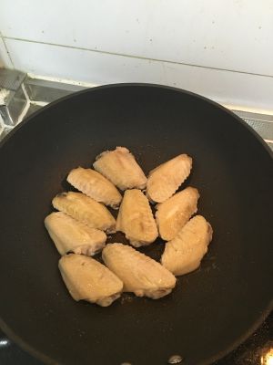 另起油锅,小火,滑入鸡翅,煎至两面金黄