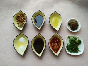 准备好各种调料:辣椒油15ml,陈醋15ml,生抽15ml,香油5ml,白砂糖3克,食盐2克,花椒粉2克,酥黄豆20克,香菜碎5克,老坛酸菜10克;