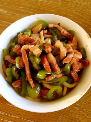 青椒切丝备用,锅内热油,六成热放入肉丝,煸炒出肥油后加入青椒,翻炒几下,放一勺酱油,半勺糖,继续翻炒,之后加入一大碗水,将乌冬面放入锅中,水刚好摸过面条即可,开大火煮沸,加入淀粉水,收汁,出锅