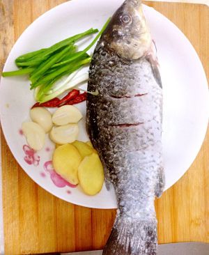 准备一壶开水备用,米饭蒸上,淘米的水留着洗鱼,起到去腥的作用。 鱼洗净后将葱塞进鱼肚里,也是起到去腥的作用 。