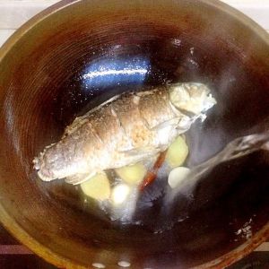 鱼煎好后倒入开水没过鱼身