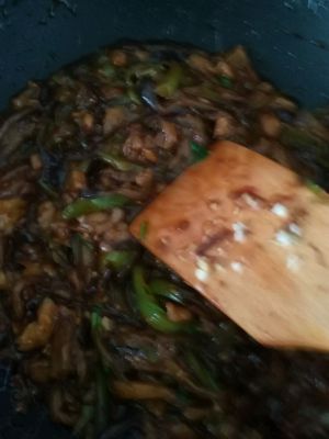开始最后一道程序啦,等油锅热了放几颗花椒,豆瓣酱,葱姜蒜,炒香后依次放入准备好的青椒,木耳,进行翻炒,然后放入茄子,糖,酱油,盐,水,根据火候炒几分钟就可以出锅啦。很下饭哦
