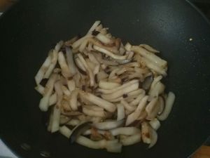 另起锅下底油,煸香葱姜蒜末和豆瓣酱后下肉末迅速炒散。放白糖、少量酱油、醋和清汤(没有清汤可放白水),再下入炸好的茄子。收干汁后用水淀粉勾芡,最后加入鸡精即大功告成。