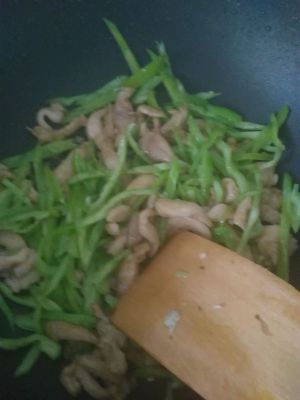 青椒切丝,窄油煸炒鸡丝,煸熟后加入青椒丝,翻炒一分钟,出锅