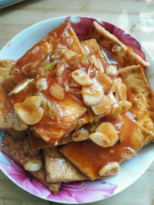另起油锅,暴香葱姜,放入辣椒酱,醋,糖,盐味精,倒入炸好豆腐迅速翻炒,使豆腐两面沾上姜汁既可