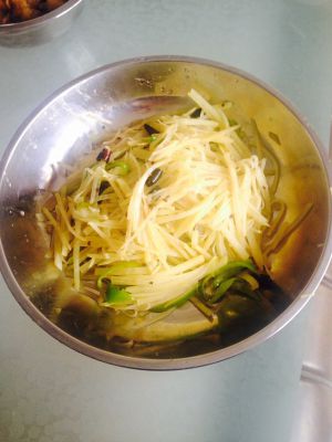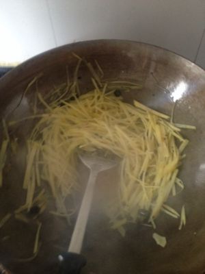 放入土豆丝和青椒丝,翻炒至土豆丝呈半透明状,放入白醋精盐翻炒片刻即可。