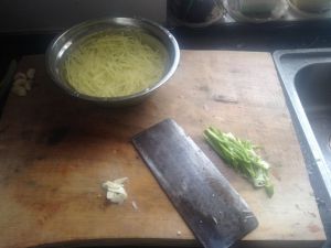 准备好蒜辣椒和土豆丝,鲜辣椒切丝蒜切片,干辣椒切成小段