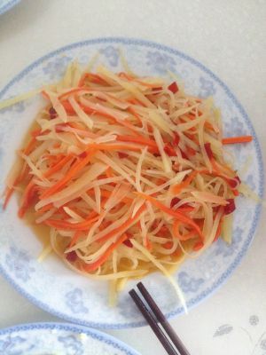 在锅中倒入猪油和植物油倒入胡萝卜和土豆丝倒入醋,翻炒3分左右,加入水,等水开加入盐糖辣椒酱,翻炒,最后再加点醋翻炒!可以装盘