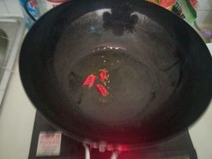 锅里加油,油热后放入干辣椒焙出香味后放入新鲜红辣椒辣椒和大蒜。(干辣椒不可炸太久,否则太胡会影响口味;青椒到最后放,否则会变黄)