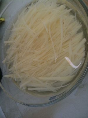 土豆切丝,清水淘洗两次,去粉后用清水泡着备用(也不要泡太久),同时在清水里滴入几滴白醋。(刀功有待提高)