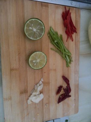 新鲜辣椒,干辣椒,大蒜,柠檬切好备用。