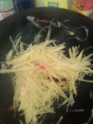 土豆丝去水,入锅,翻炒1-2分钟后倒入醋汁。差不多炒熟时放入青椒和盐。