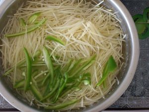 土豆去皮切丝,青红辣椒切丝备用