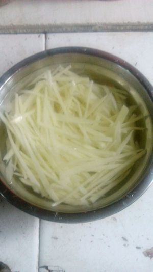 土豆刮皮切成薄片,再切成丝,泡在清水里,过滤几遍,一般3遍就差不多了,以手触摸没有粉粉的感觉就可以了,水也比较清澈,就可以沥干,备用。