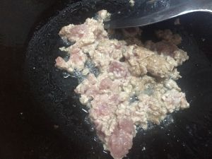 锅中留点底油,加入肉末,加点料酒和盐翻炒至稍稍干