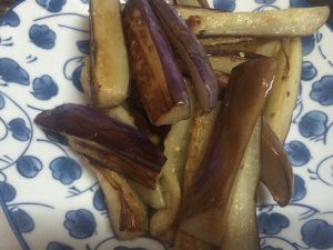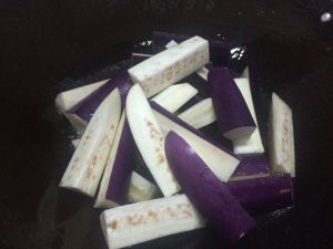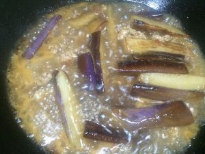 茄子切段,锅里加多些油,下茄子煎,一直到茄子皮颜色变深,茄子呈金黄色变软就可以捞出了